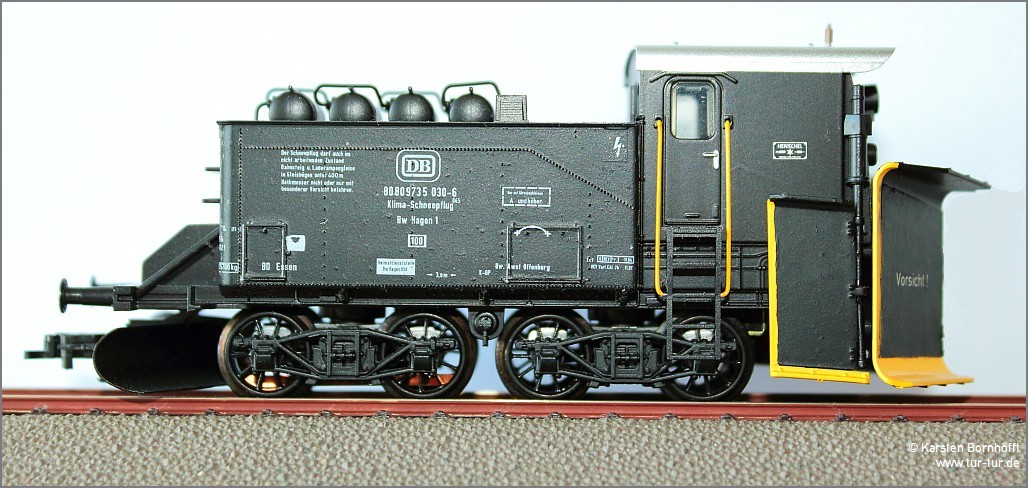 Das von mir verfeinerte Modell (Trix 23996) mit selbstgebautem Spurschneepflug, lackierten Pflugscharen und neuer Beschriftung von www.Krueger-Modellbau.de