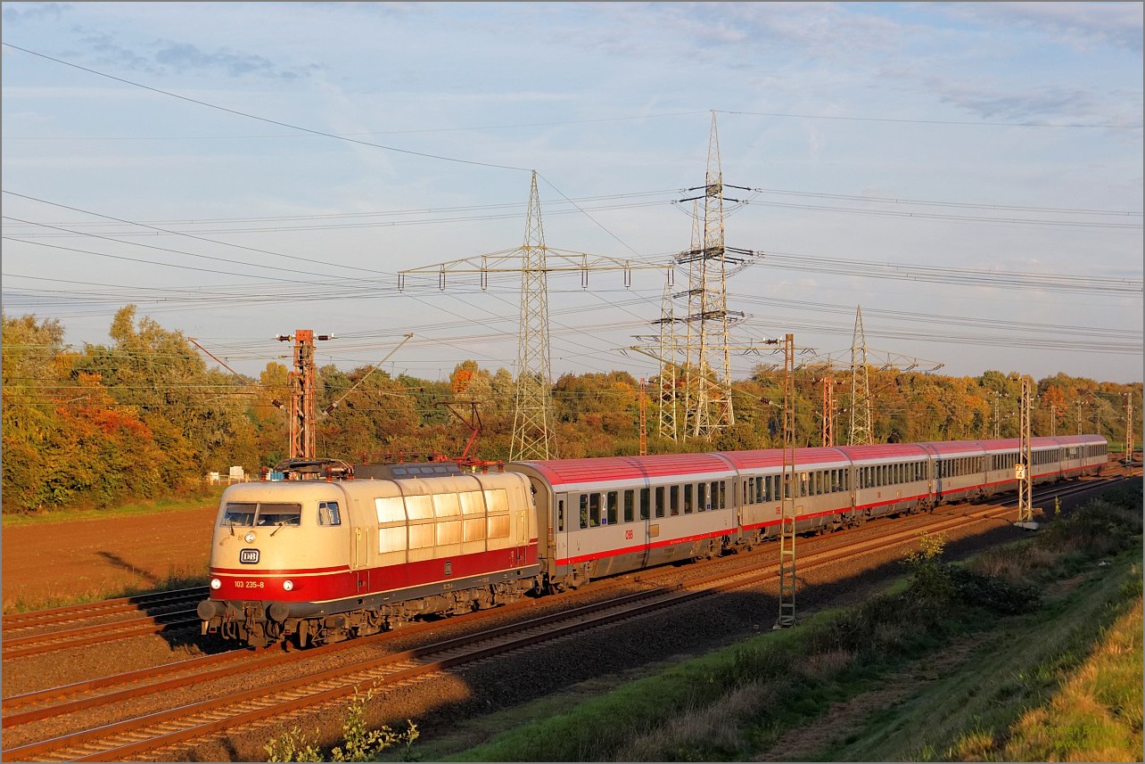 Der Starzug des Jahres 2013 war der IC 118/119, der planmäßig zwischen Stuttgart und Münster mit 103 bespannt wurde. Die etwa 10-minütige Verspätung des Zuges machte am 19.10.2013 dieses Sonnenaufgangsfoto bei Langenfeld möglich.